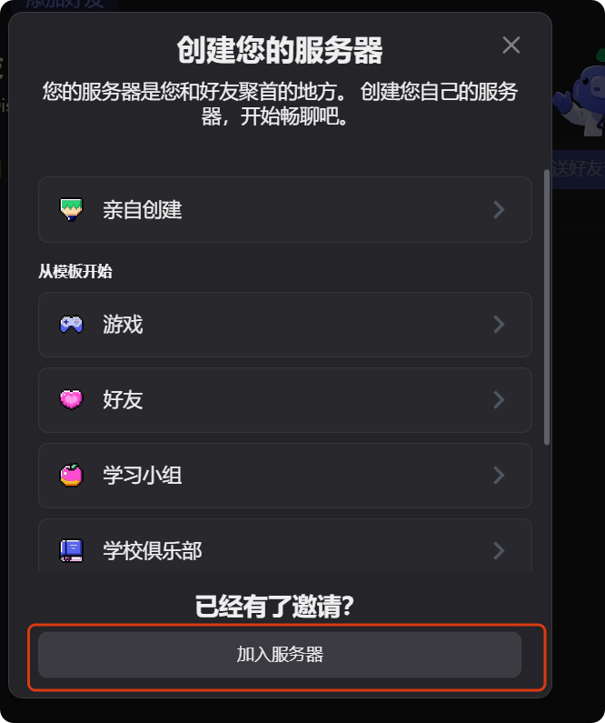 如果你想通過他人的邀請鏈接加入服務器,則直接點擊下方的“加入服務器”,然後複製黏貼邀請鏈接即可加入好友的服務器。